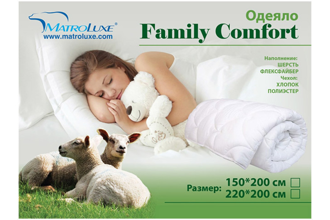 Фэмили комфорт от Фабрики Матроюкс это очень теплое, натуральное, красивое зимнее одеяло в чехле из хлопка и полиэстера с наполнением из овечьей шерсти с флексфайбером.