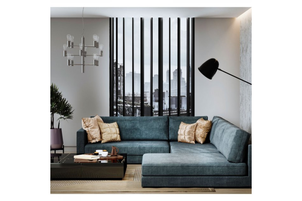 Кутова форма дивана передбачає поєднання двох або кількох елементів під прямим кутом в результаті чого виходить фронтальне сидіння зі спинкою а з боку ще додаткове м'яке сидіння зі спинкою або без залежно від конструкції моделі.