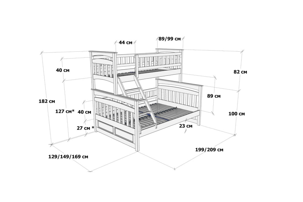 - Висота спального місця: нижнє — 27 см; верхнє — 127 см
