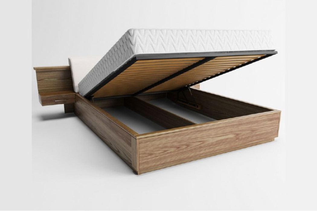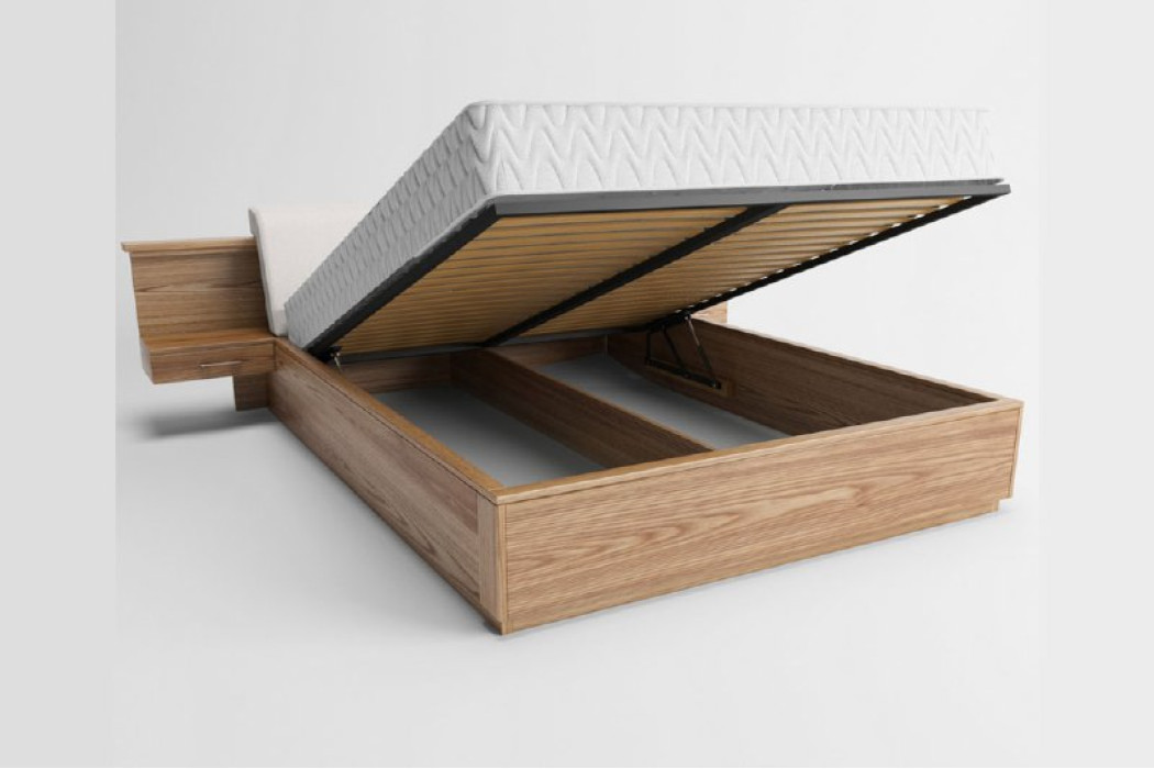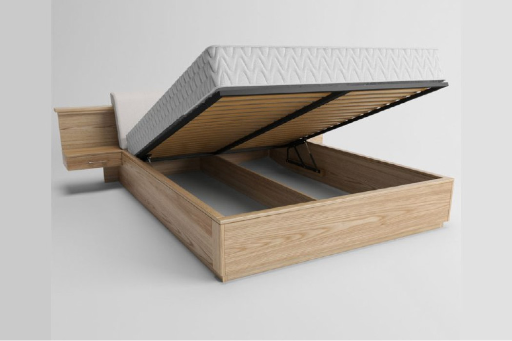 Ліжко з масиву ясена Делоріан з підйомним механізмом та підвісними полицями.