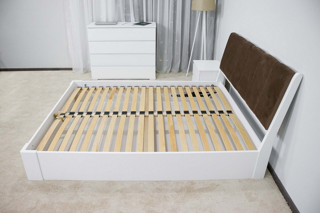 - Основание под матрас: металлическая рама с ортопедическими ламелями (расстояние между ламелями 4-5 см)