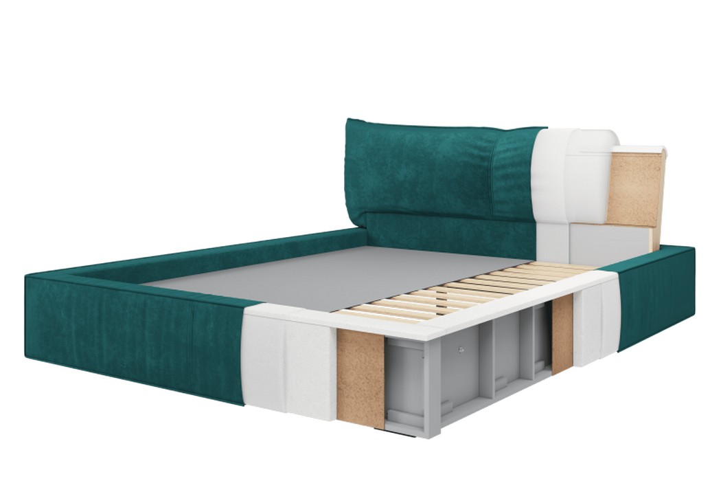 Каркас ліжка виготовлений із поєднання ДСП, ЛДСП, ХДФ, натурального дерева, фанери та ППУ. Така багатошарова конструкція забезпечує високу міцність, стійкість до навантажень і довгий термін експлуатації без деформацій.