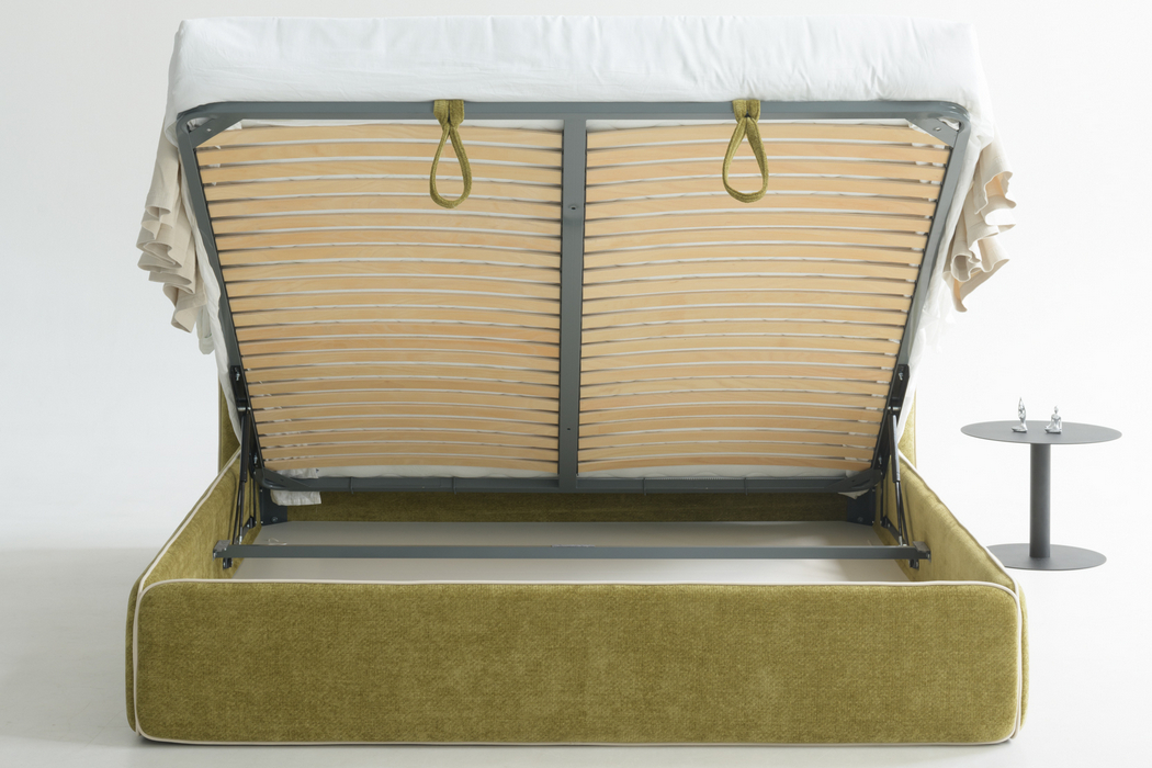 - З підйомним механізмом: металева ортопедична основа з труби 30×30×2 мм, ламелі кроком 4,5 см, газові амортизатори, опорні траверси 20×40×2 мм, знімне дно ЛДСП у 3 частинах, буферна щітка по периметру дна, глибина ніші 15 см.