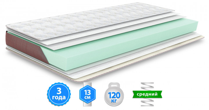 Основу матраца становить сучасна еластична піна Aero Foam з осередками різного діаметра. Вона адаптується до форми тіла, забезпечуючи правильну підтримку хребта та рівномірний розподіл тиску. Додатковий шар синтепону робить поверхню м’якішою, а міцний турецький трикотаж забезпечує довговічність і приємну на дотик текстуру.