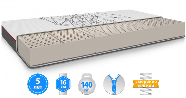 Основа матраца складається з монолітного блоку чистого латексу з 7 зонами жорсткості. Завдяки зональному розподілу жорсткості матрац адаптується до анатомічних особливостей тіла, підтримує хребет у правильному положенні та забезпечує оптимальний розподіл навантаження. Перфорація по всій товщині блоку покращує повітрообмін і забезпечує ефект «дихаючого матраца», запобігаючи перегріванню під час сну.
