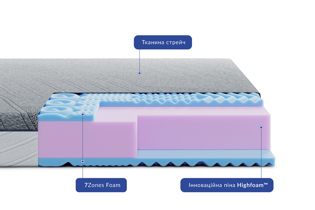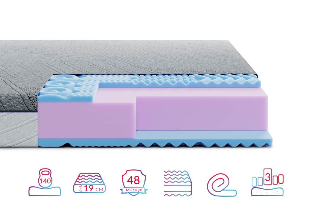 - Анатомічна підтримка: рівномірно розподіляє вагу тіла, знижує навантаження на хребет і суглоби, забезпечує правильне положення під час сну та запобігає болю у спині.