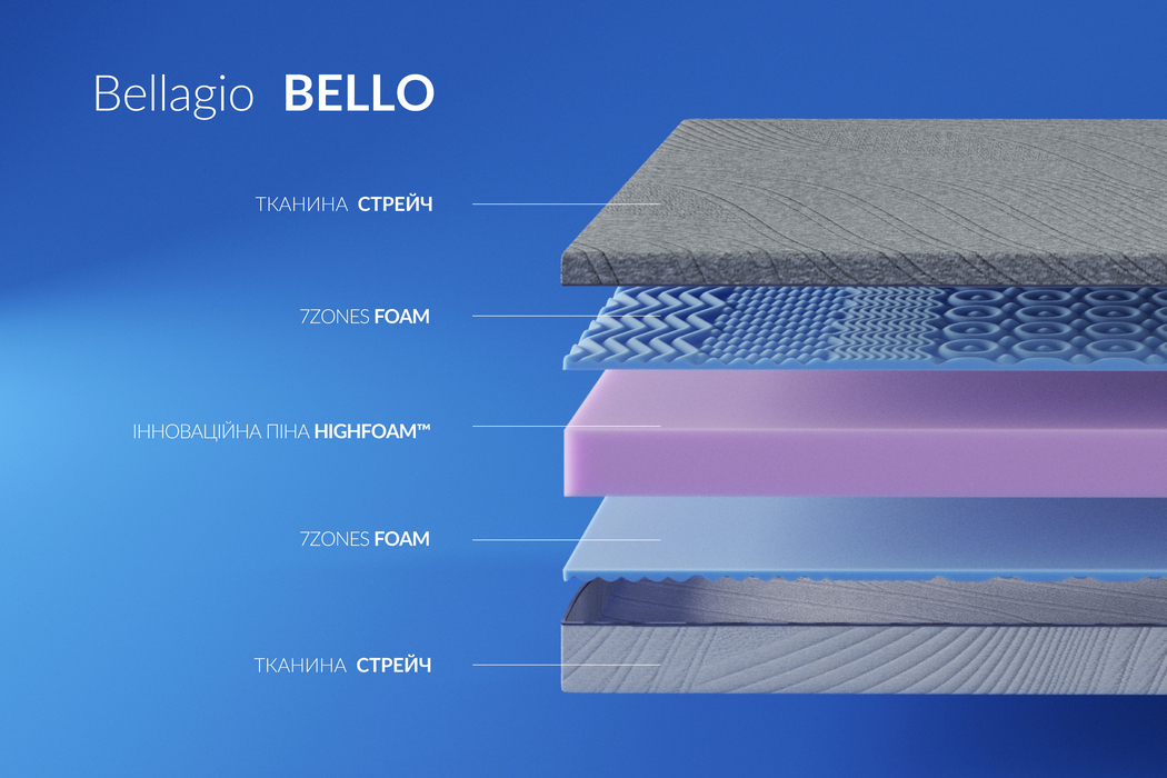 Bello Bellagio — це сучасний безпружинний ортопедичний матрац із серії Bellagio від українського виробника Highfoam. Він створений для тих, хто цінує здоровий сон, комфорт та турботу про опорно-руховий апарат. Завдяки масажному шару та анатомічним властивостям матрац ідеально підходить людям із високим фізичним навантаженням, спортсменам, а також тим, хто багато часу проводить на ногах.
