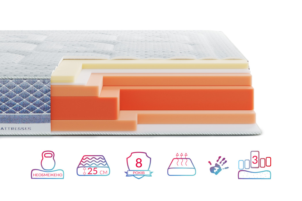 - Висота: 25 см — забезпечує достатню товщину для комфортного сну й стабільної підтримки.