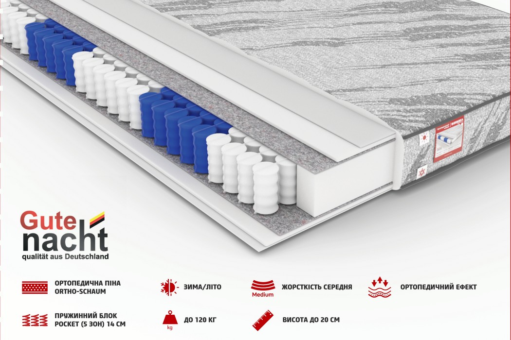 - 5-зонний пружинний блок Pocket — незалежні пружини, які точково адаптуються до будови тіла.