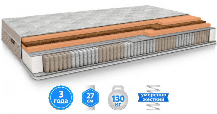 Матрац має висоту 27 см і відноситься до жорстких моделей, що робить його відмінним вибором для тих, хто потребує максимальної підтримки хребта. Він розрахований на навантаження до 130 кг на одне спальне місце, що забезпечує надійність навіть для людей із великою вагою.