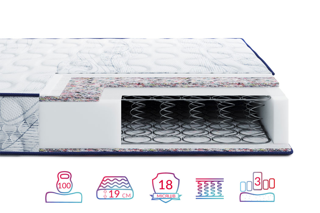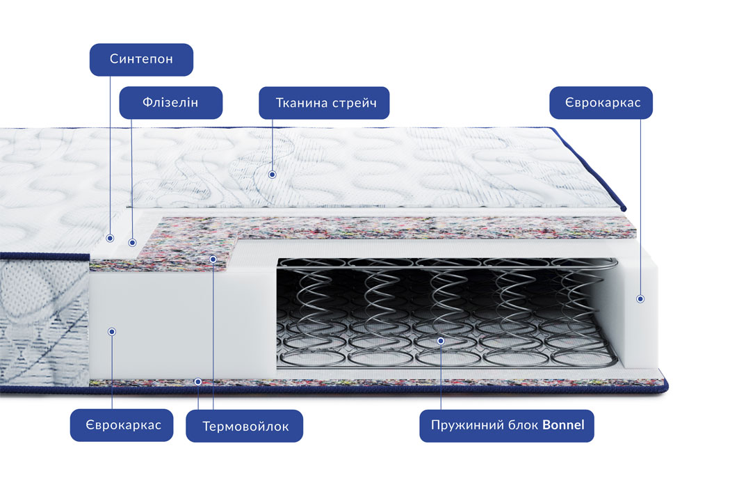 По периметру матраца використано єврокаркас з пінополіуретану високої щільності. Він запобігає просіданню країв і підтримує форму навіть при інтенсивному використанні.