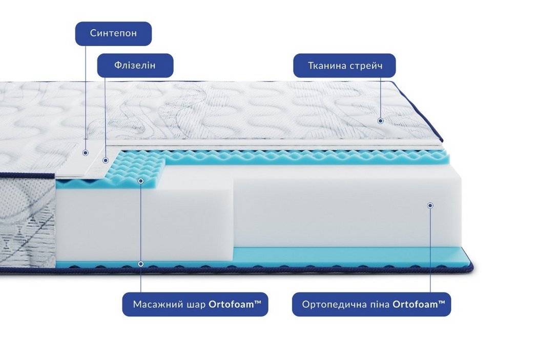 Основою матраца є монолітний блок ортопедичної піни Ortofoam, доповнений двома тонкими шарами масажної еластичної піни. Така комбінація створює збалансований рівень пружності, забезпечує правильну підтримку тіла та сприяє зняттю напруження з попереку й плечей.