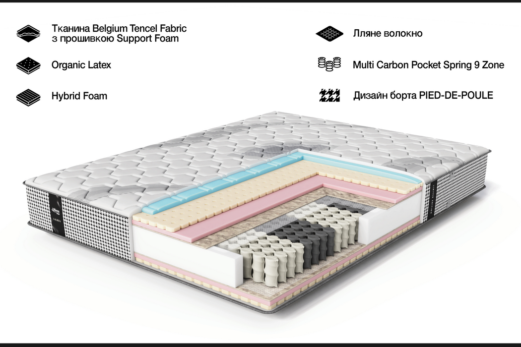 - Наповнення: Піна Hybrid Foam, Латекс Organic Latex, Лен, Спанбонд, Пружинний блок Multi Carbon Pocket Spring 9 Zone