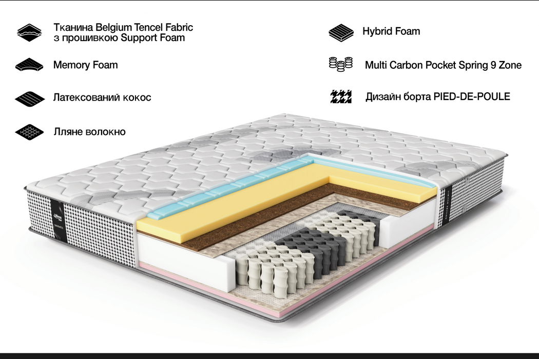 Тип: пружинний, незалежні пружини Multi Carbon Pocket Spring 9 Zone