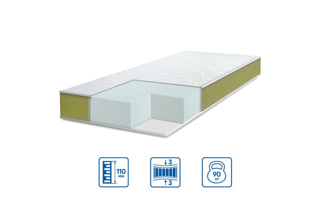 Основа з монолітної еластичної піни рівномірно розподіляє навантаження, підтримує природне положення хребта та не деформується з часом. Матрац стійкий до навантаження до 90 кг на одне спальне місце.
