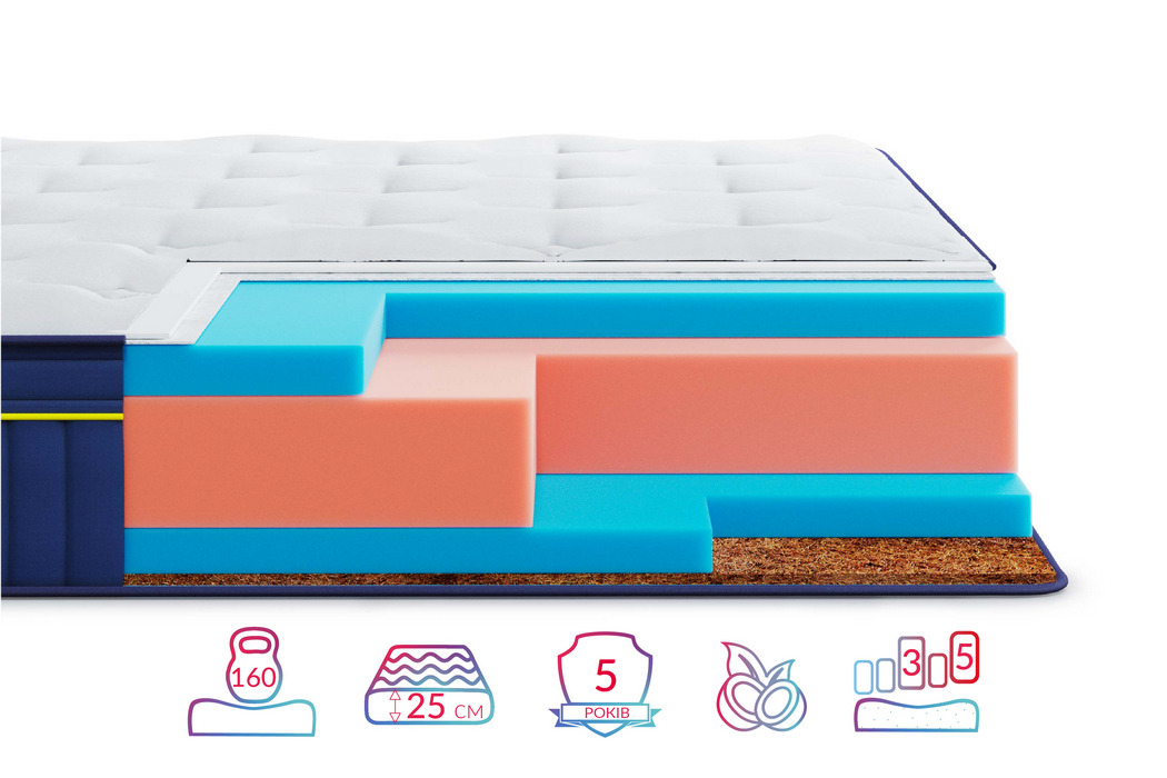 - Зима/Літо – різні сторони матраца адаптовані до сезонних змін, що забезпечує комфортний мікроклімат у будь-яку пору року.