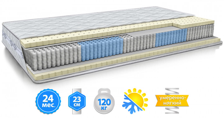 За рахунок використання 3-зонного пружинного блоку матрац забезпечує максимально комфортні умови для сну, надійну і делікатну підтримку хребта, високий ортопедичний ефект.