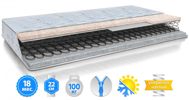 Ортопедичний двосторонній матрац середньої жорсткості що виготовляється на основі пружинного блоку Боннель, який покривається подвійним настилом з жорсткого повсті і м'яким настилом з матеріалу Спрут з використанням вовняних і бавовняних волокон.