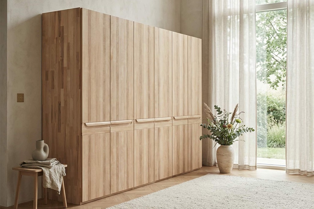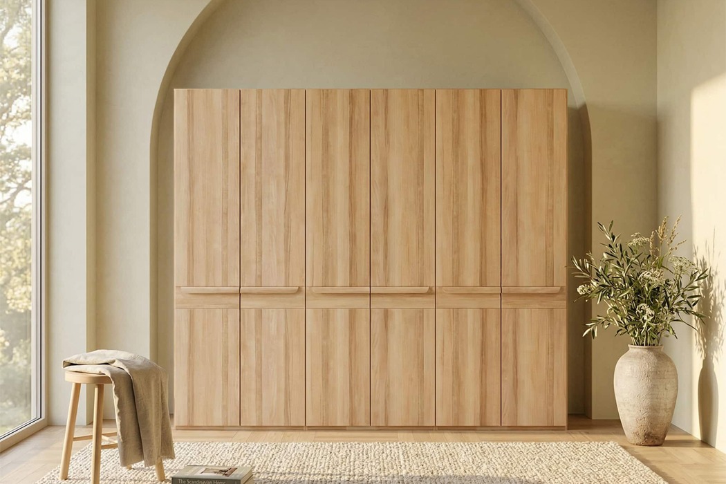 Шафа Глорія 4-дверна - це містка система зберігання нового покоління, створена для тих, хто цінує порядок, комфорт і натуральні матеріали. Вона поєднує сучасний дизайн, продуману внутрішню організацію та природну красу деревини, гармонійно вписуючись у простір просторих спалень.Матеріали та екологічність