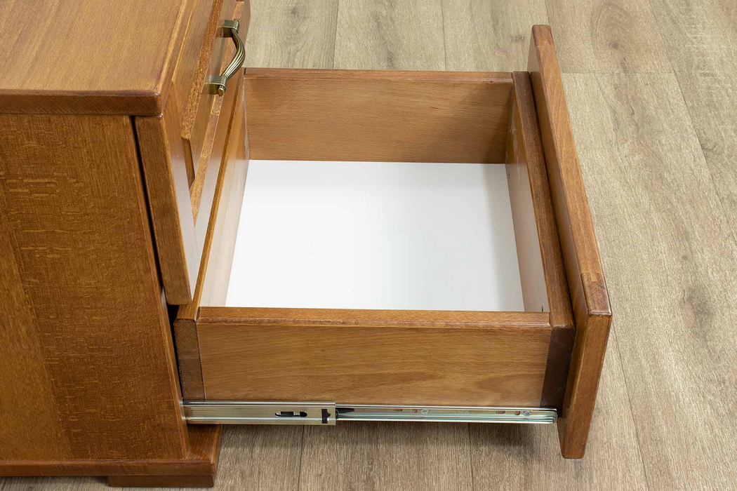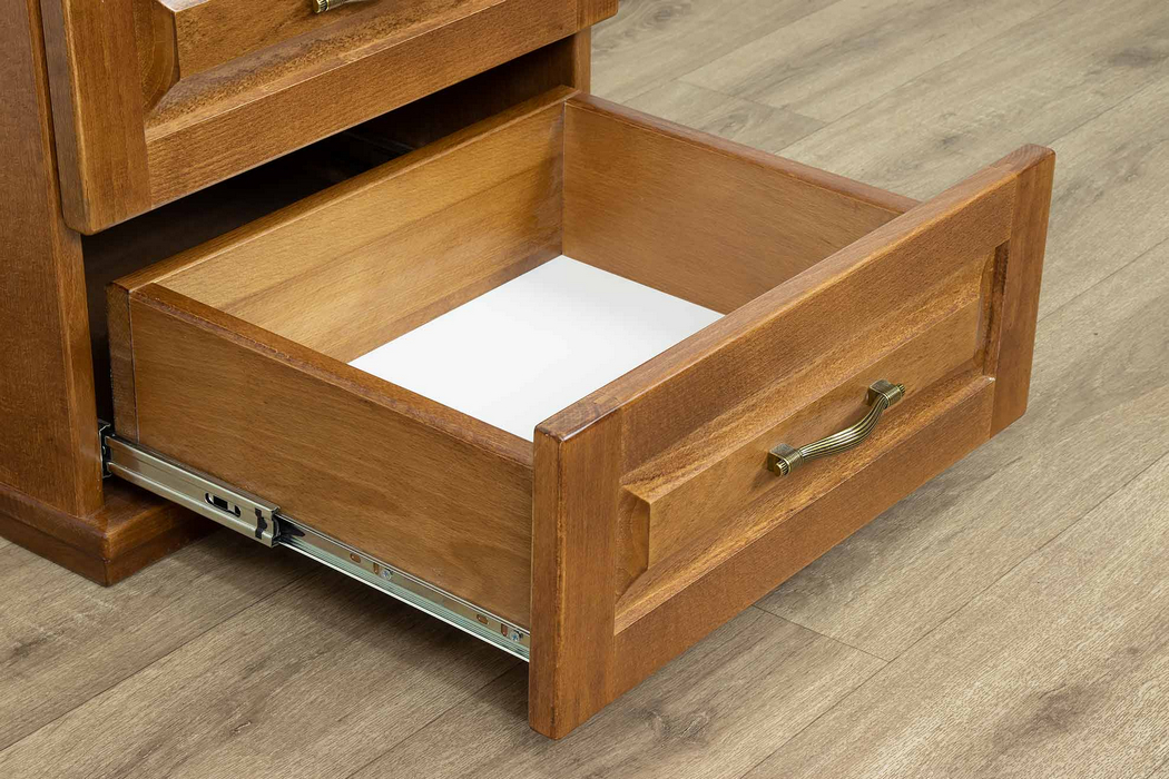 Модель оснащена шухлядами на телескопічних направляючих з шариковими підшипниками. Таке рішення забезпечує плавне та безшумне висування, що підвищує комфорт користування у щоденному побуті. Ящики шухляд виконані також із букової дошки, що додає конструкції додаткової надійності та гармонійного вигляду.